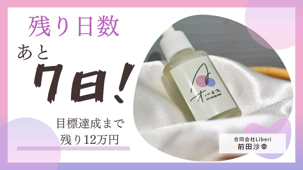 こんばんは!クラウドファンディング終了まで残り7日となりました。長いと思っていましたが、あっという間に残り7日になってしまいました。なんだか寂しい気持ちです(@_@)先日も報告させていただきました通り、嬉しいことにデリケアオイル完売致しました。そこで、、、、追加リターンを用意させて頂きました^^デリケアオイル限定10本ですが、本日追加させていただきましたので、ぜひこの機会にご覧ください◎残り7日ですが、ネクストゴールに向けてやり抜きます!!!!!!!