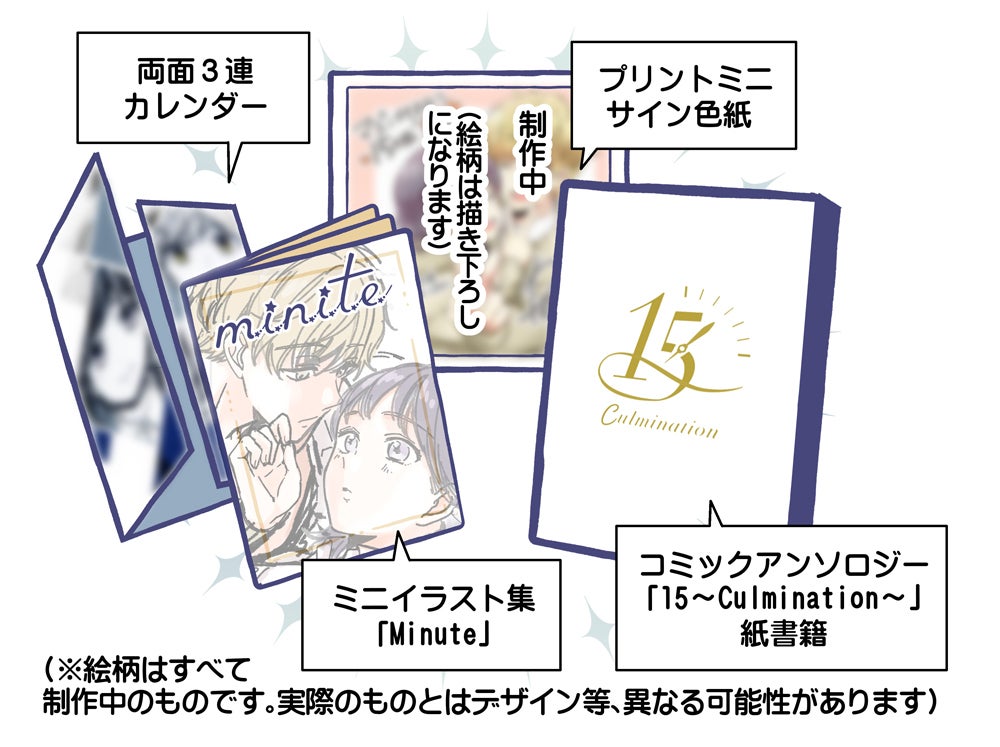 2023/06/24 22:26こんにちは。Pericomicスタッフの藤白です。支援者の皆さま、大変お待たせいたしました。すべてのリターン品の発送開始日が決定いたしましたのでご報告いたします!7月3日~発送開始、7月15日頃までにはすべての方にお届けが完了できる見込みです。現在は梱包作業が着々と進められており、お届けは「コースごと」となります。複数のコースをご支援いただいている方は、それぞれ別のお荷物として複数回お受け取りいただくことになりますので、不在票の見落としなどが無いようにご注意ください。▼こちらは3000円コースのアクスタの完成版デザインです!プレート全体まるごと可愛く仕上がりました~!実物もぜひご期待ください!▼全巻セットのブックケースも装飾・加工を全面に施して、特別感が満載です…!本棚での存在感バッチリの完全保存版です!▼こちらは、これまでのイラストを網羅したイラスト集「minute」の表紙です!「15分前」の3年間を振り返るような、エモさ溢れる1冊が完成しました!▼3連カレンダーは両面フルカラー!表面ではMVでのみ使用された祐希と夏葉のイラストが、シックな色合い且つ可愛いデザインになってお手元に~!今年12月までの半年カレンダーです!……などなど、新たなデザイン、新たなイラストで沢山のグッズを完成させることができました。これもひとえに、ご支援をいただき、到着をお待ちいただいている皆さまのお陰です。本当にありがとうございます!到着をぜひぜひ!楽しみにおまちください!■■■住所変更のお届けについて■■■発送時期が7月上旬となったことで、転居のタイミングとお届けが重なってしまう方もいらっしゃるかと思います。キャンプファイアのサイト内での登録を更新いただいてもこちらには通知などが届かないため、個別にお知らせいただく必要があります。大変お手数をおかけしますが、該当される方がいらっしゃいましたら pericomic.info@gmail.com までメールをお送りいただけますでしょうか。その際、以下の項目を添えてご連絡ください。(1)お名前フルネーム(2)お電話番号(3)新しいお届け先(建物名は省略しないでください)ご連絡をいただくタイミングによっては、発送先の変更手続きにお時間を頂戴する場合があります。ご不明なことがありました際にも、上記の連絡先までお声掛けください。(Pericomic 藤白) もっと見る