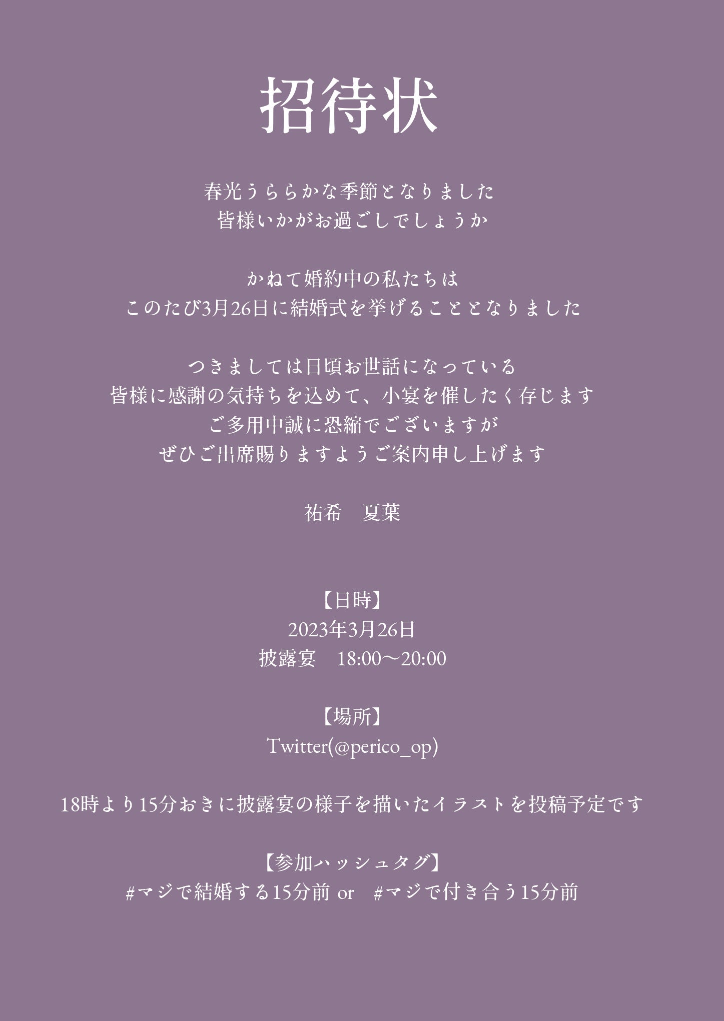 こんにちは、Pericoです。明日は祐希くんと夏葉ちWeb結婚式!