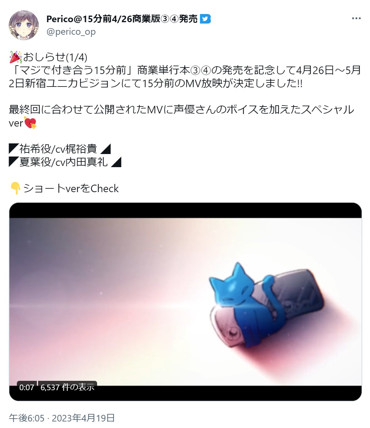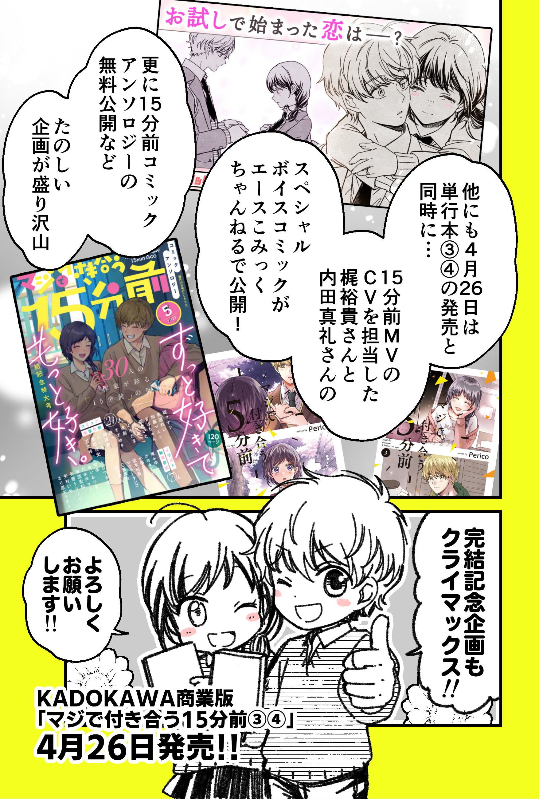 4月26日に、梶裕貴さんと内田真礼さんの「マジで付き合う15分前」ボイスコミックがエースこみっくちゃんねるで公開予定です、こちらも楽しみにしていてくださいね。
