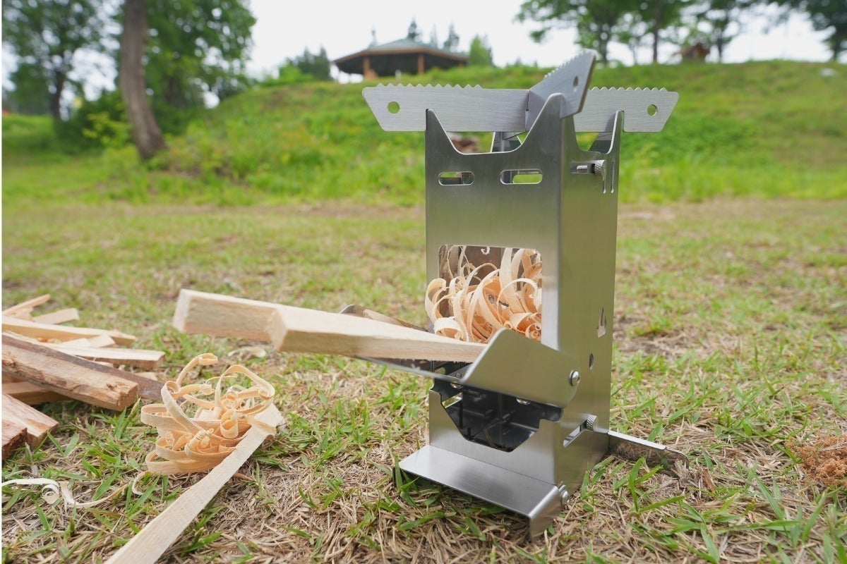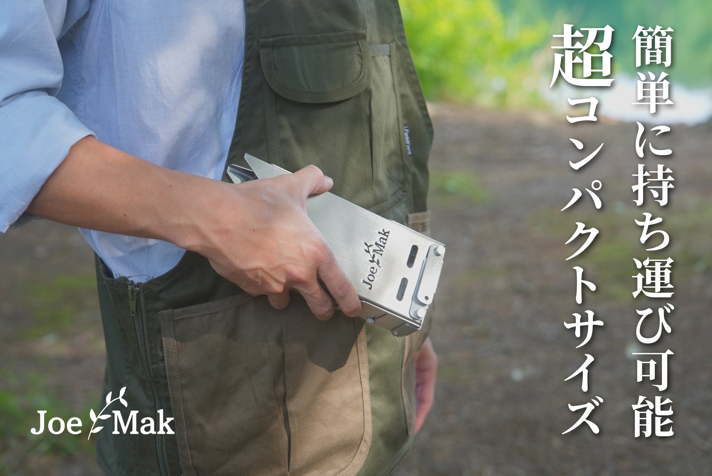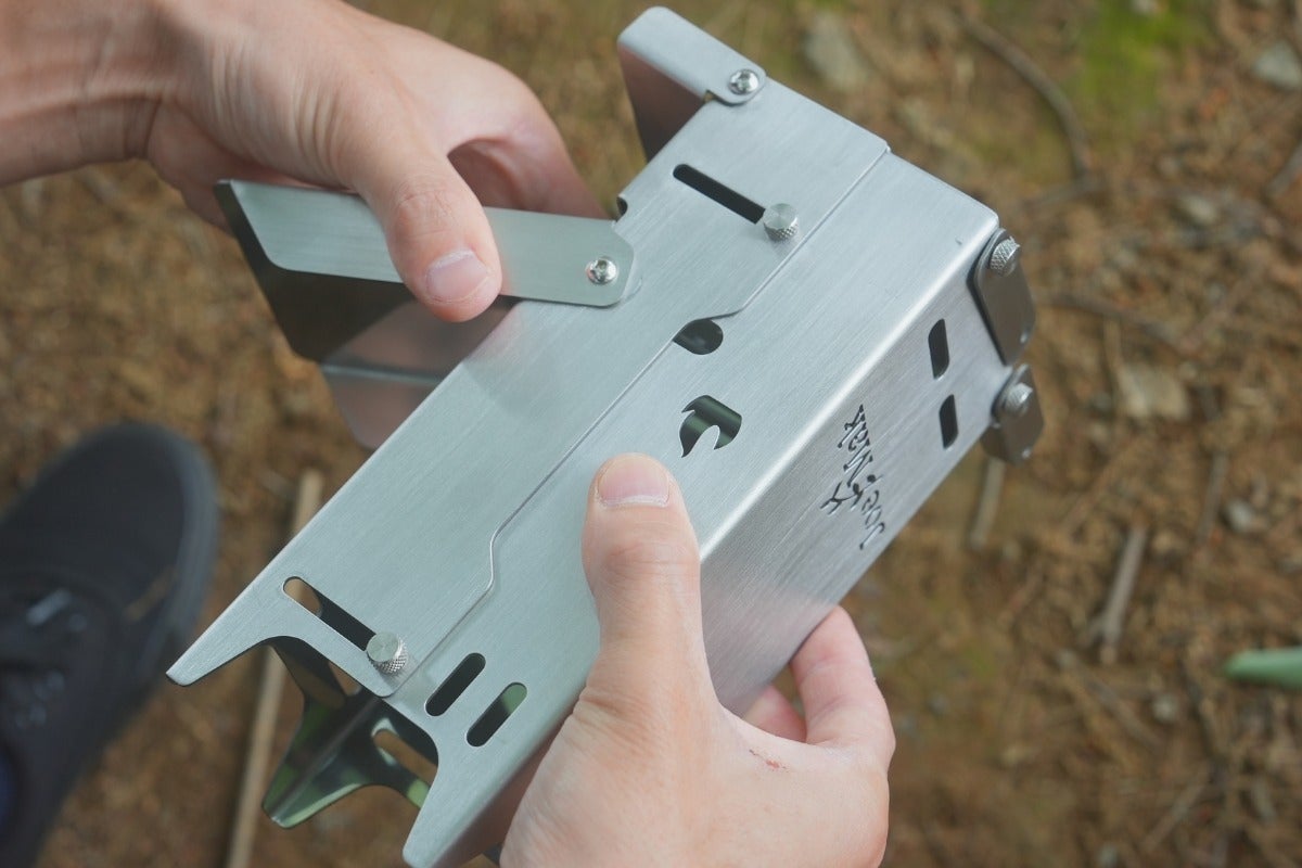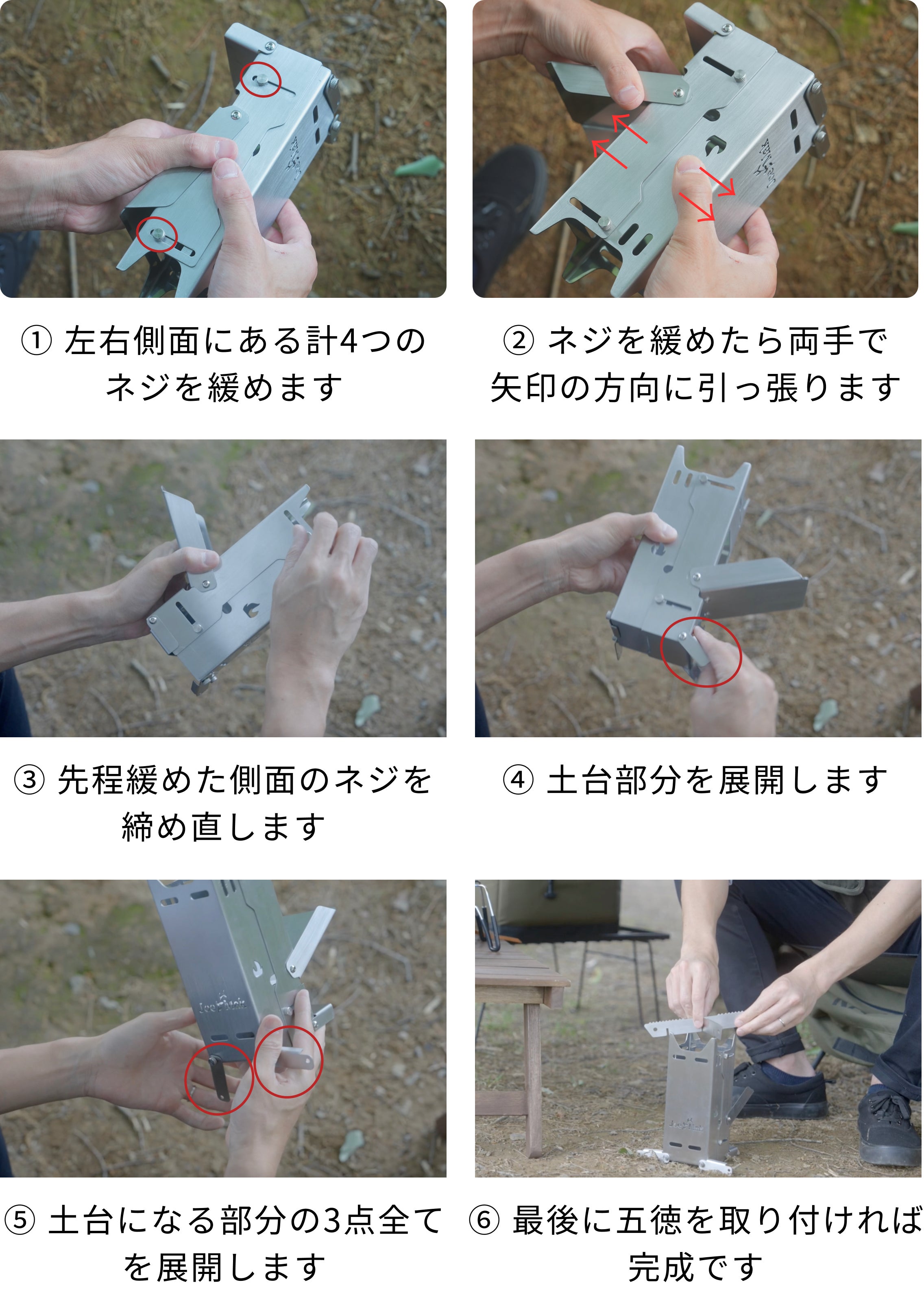 ネジを緩めて本体を広げてネジを締め、土台を広げて、五徳を乗せて完了です!