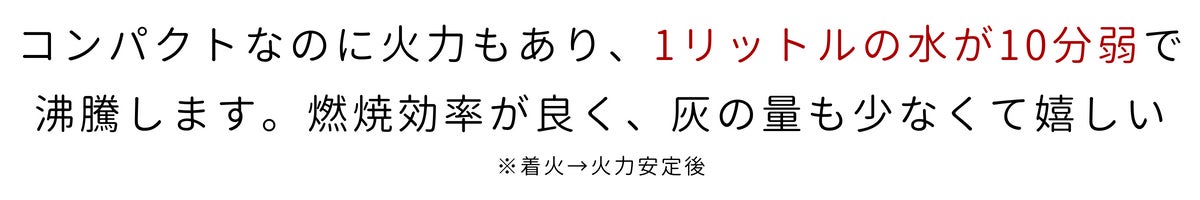 A:1リットルの水は10分で沸騰しました。※着火後安定してから沸かしています。