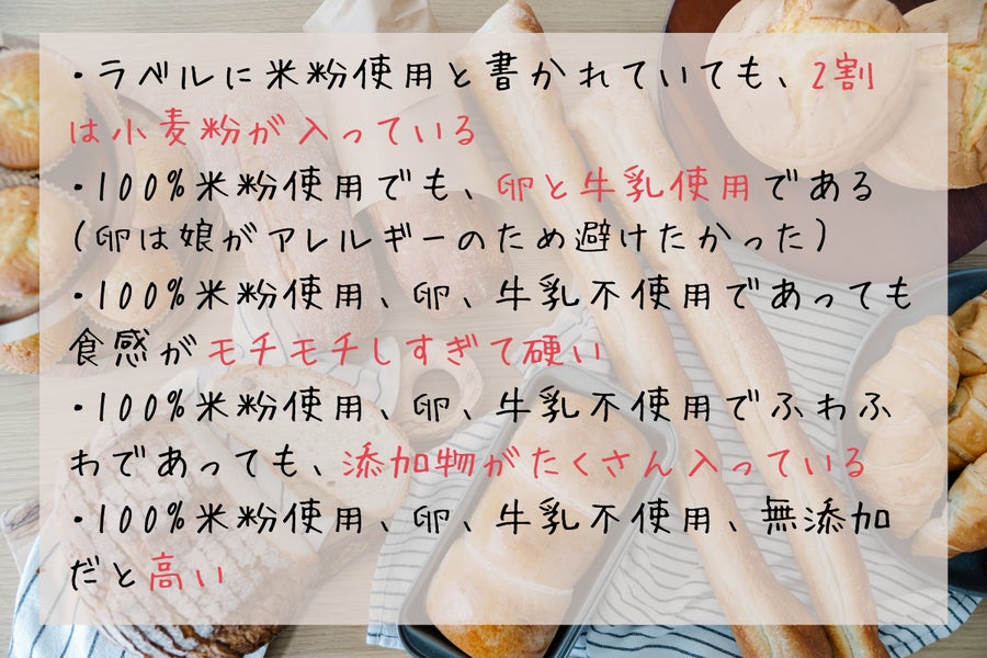 お子さんにやご自身にアレルギーがあると、普通のパン屋さんに行っても「子どもが食べたいもの」や「自分が食べたいもの」基準で選べないと思います。並べられているパンの中から、食べられるモノを消去法で選ぶのではないでしょうか。