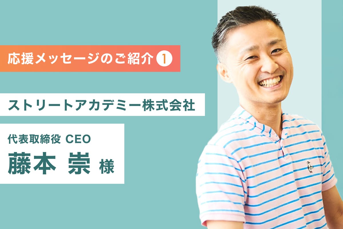 本日は昨年私が参加しておりましたビジネスコンテスト TOKYO STARTUP GATEWAY 2022にて大変お世話になりました、ストリートアカデミー株式会社 代表取締役 CEO の藤本 崇様より応援のメッセージをいただきましたのでご紹介いたします!