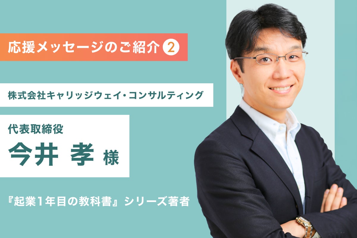 株式会社キャリッジウェイ・コンサルティング 代表取締役。著書『起業1年目の教科書』は5万部を超えるベストセラー。シリーズでは10万部を超える。紹介だけで常に300人規模のセミナーを満席にするマーケティングシステムを構築し、10年連続満席。延べ参加者は6,000人。クライアントの多くは、売上100万円~4,000万円を超える。誰にでもわかりやすく、行動しやすいノウハウと伝え方で、「今井さんの話を聞いたら安心する」「自分でも成功できるんだと思える」「勇気が湧いてくる」と、たくさんの起業家に支持されている。