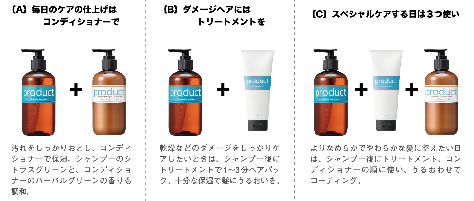 「シャンプーモイスト」「コンディショナーモイスト」に「ヘアトリートメントモイスト」が仲間入りしたことで色々なケアができるようになりました。