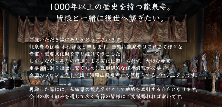 今回のプロジェクトでは、檀家のないお寺で飛鳥時代から続く古刹『龍泉寺』の建て替え、修理を行うための資金集めをさせていただきたいと思いプロジェクトをスタート致しました。