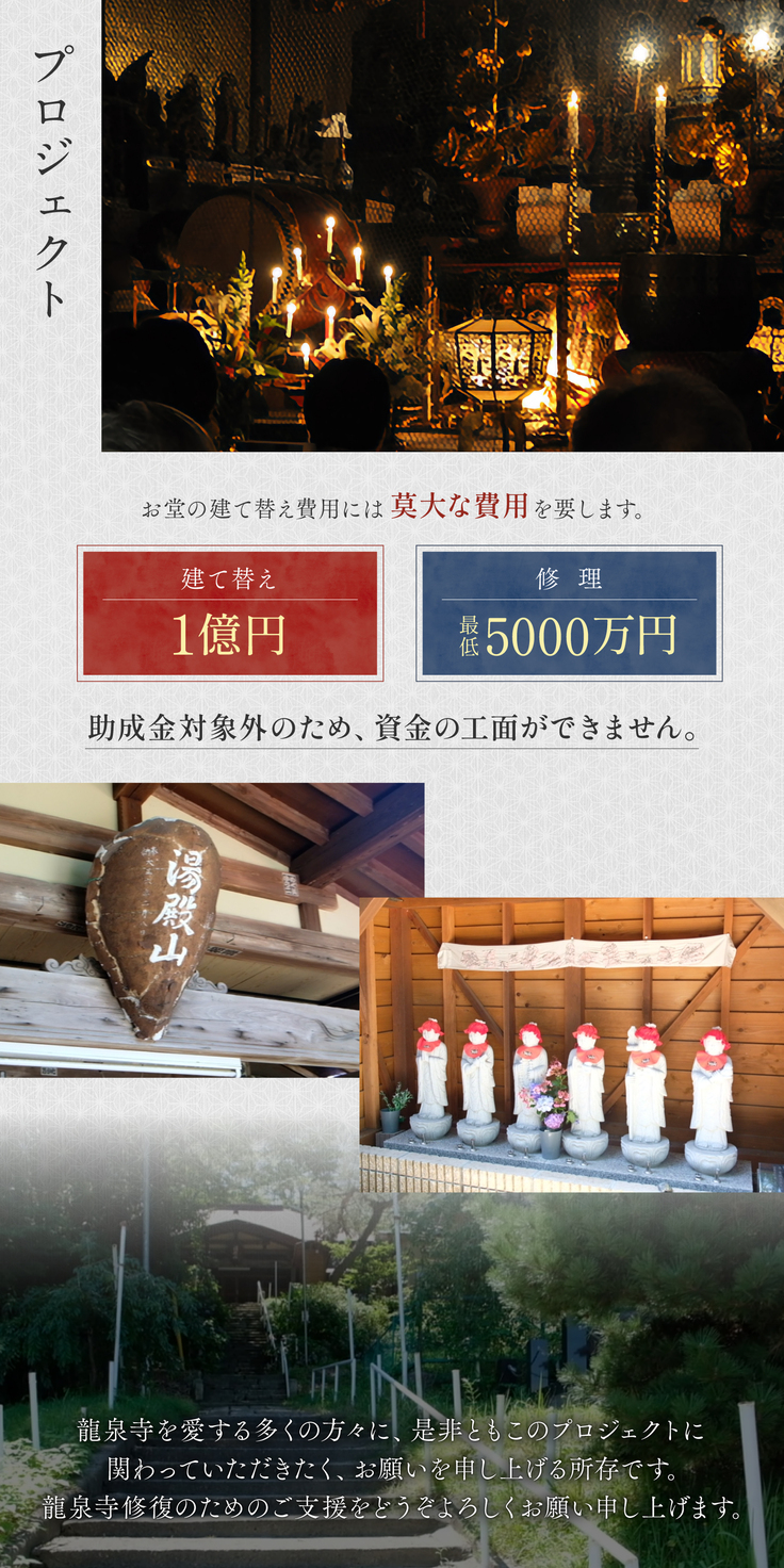 龍泉寺には檀家もなく、厄除祈願や護摩祈祷など、日々龍泉寺にご参拝いただく皆様によって支えられている寺院でございます。ご参拝いただきました方のみならず今回の取り組みを通じて広く有縁の皆様にご浄財を賜れましたら幸いでございます。