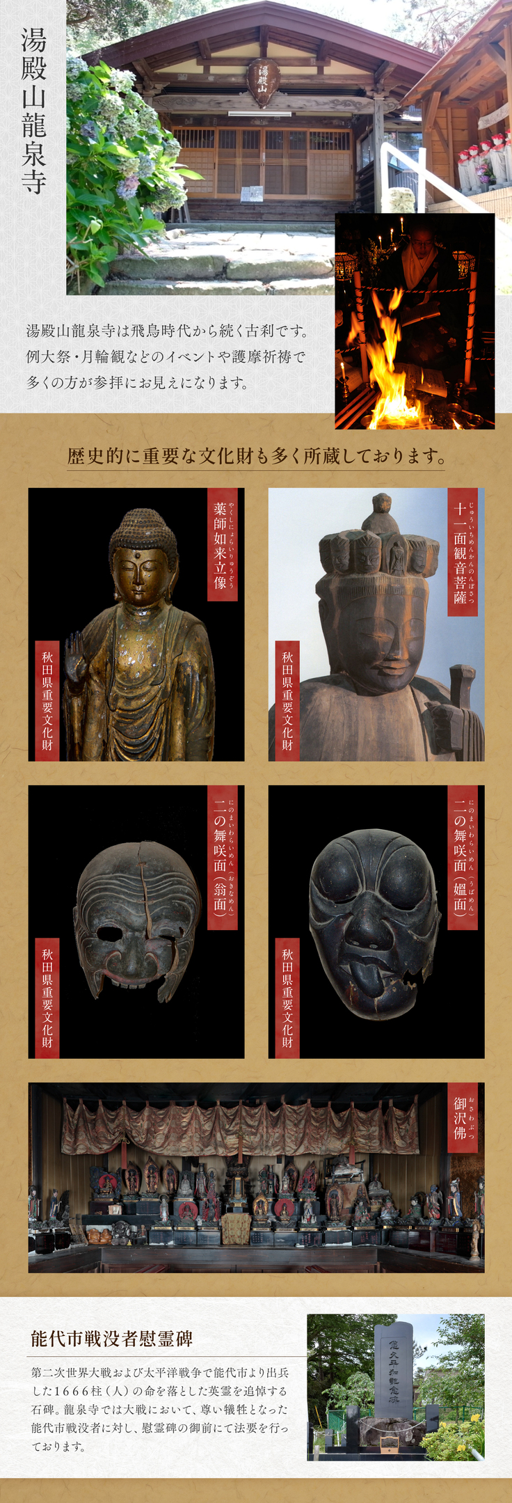 四十三段の石段をゆっくり時間を掛けてのぼると、目の前に本堂が見える。 高台から見る日本海からの強風をまともに受けながらも樹勢盛んな松の木は美しい。飛鳥時代、わが国に仏教が伝来してまもなく、玉鳳という僧が布教にやってきて、 この地を終生の地と定め庵を構え「鳳凰庵」と名づけた。代々弟子が継承し、 養老二(七一八)年には行基も逗留したと伝えられる。その後、室町末期(一五六〇)年ごろ、 能代港の北前船海運隆盛の機縁で湯殿山の傘下に入り、湯殿山龍泉寺出張所となった。 時は流れ、明治二年、廃仏毀釈の嵐が吹き湯殿山は神社へと転じた。この渦中に遭遇した修験僧・蜜雲海は、 この出張所の寺院への道を目指した。明治十九年に寺院創立の許可申請をなし、翌、二十年、 秋田市上新城にあった高倉山観音院龍泉寺を合併し、湯殿山龍泉寺と号して独立した。