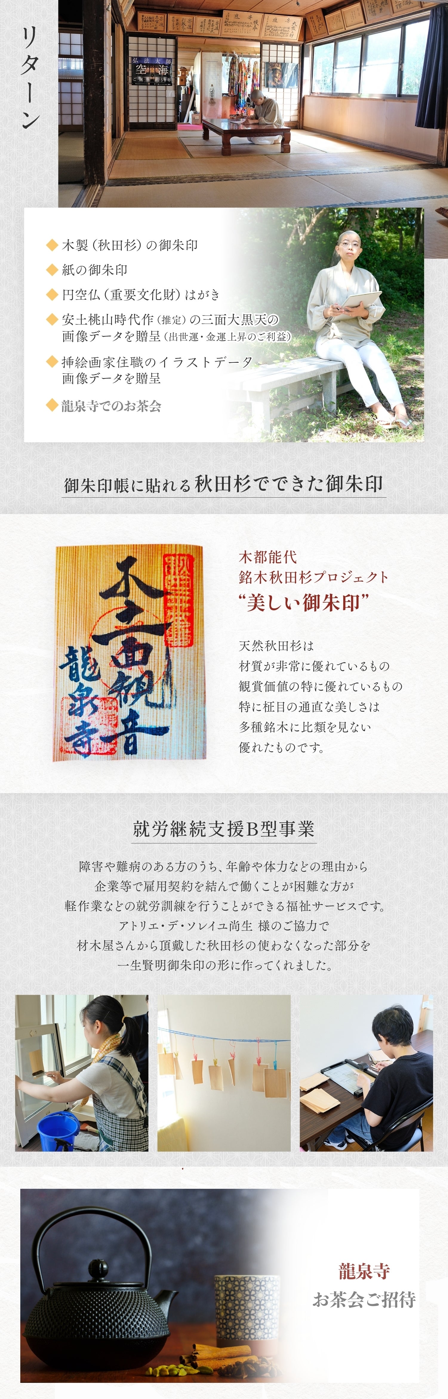 創建以来1000年以上もの歴史を歩んでおりますが、まだ参拝したことがなかったり、ご存じいただけてなかったりする方もたくさんいらっしゃいます。 今回のクラウドファンディングやSNSなどを通じ、龍泉寺がどういうお寺かを知っていただき、この機会にご縁を結んでいただき、是非龍泉寺のファンになってもらい一緒に龍泉寺を盛り立てていただければ幸いであります。