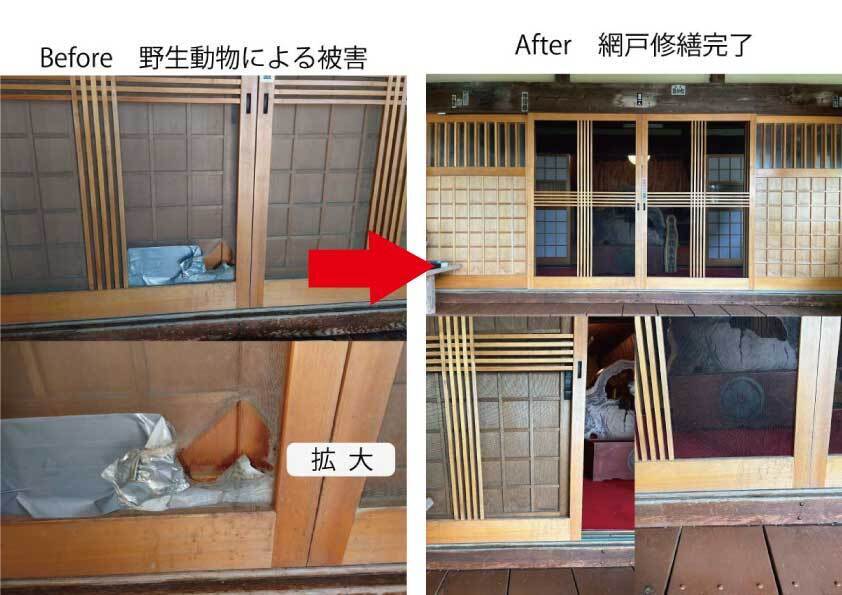 野生動物侵入による網戸の穴の修繕が完了しました。
