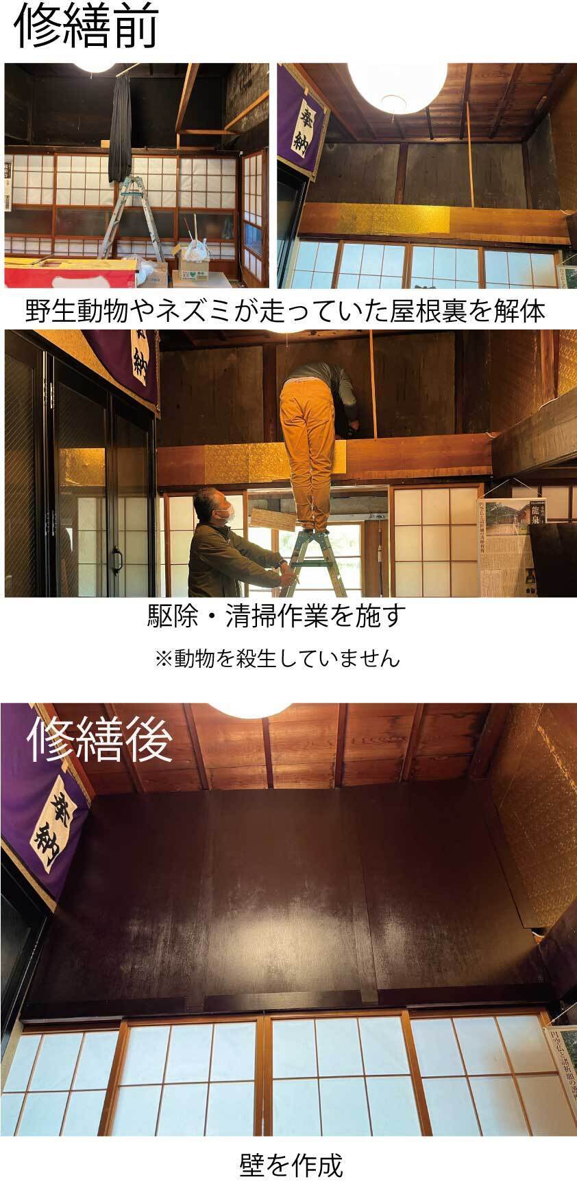 湯殿山龍泉寺は元々老朽化により修復が必要で、給与や退職金をあてながら修復を重ねてまいりましたが、この度ハクビシンが住み着いてしまいさらに大きな被害が発生し手がつけられない状況になっています。