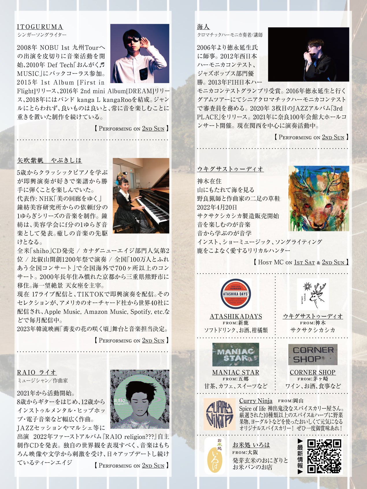 他にも、豪華なアーティストの出演が決まっています。Facebookページ/インスタグラムに最新情報を更新していますので、ぜひご覧ください!「海の音フェスタKUMANO」のチケットをぜひご購入いただき、ご支援いただくとともに、最高の音楽を一緒に楽しみましょう!