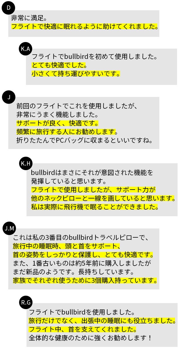 ぜひbullbirdトラベルピローを使用して長距離移動で体力消耗せずに回復してください。
