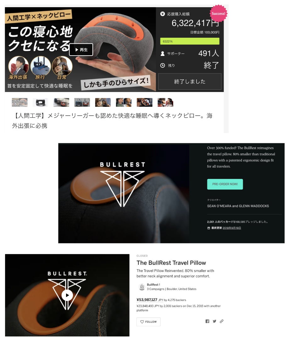 bullbirdトラベルピローは過去国内外のクラウドファンディングサイトで総額5920万円、4766人からご支援を獲得した大人気アイテム!