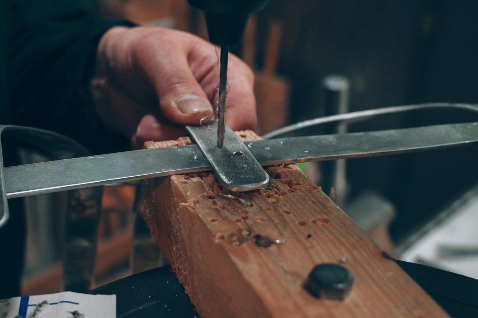 (先代の教え通りに鋲留めの穴あけも丁寧に作業します)
