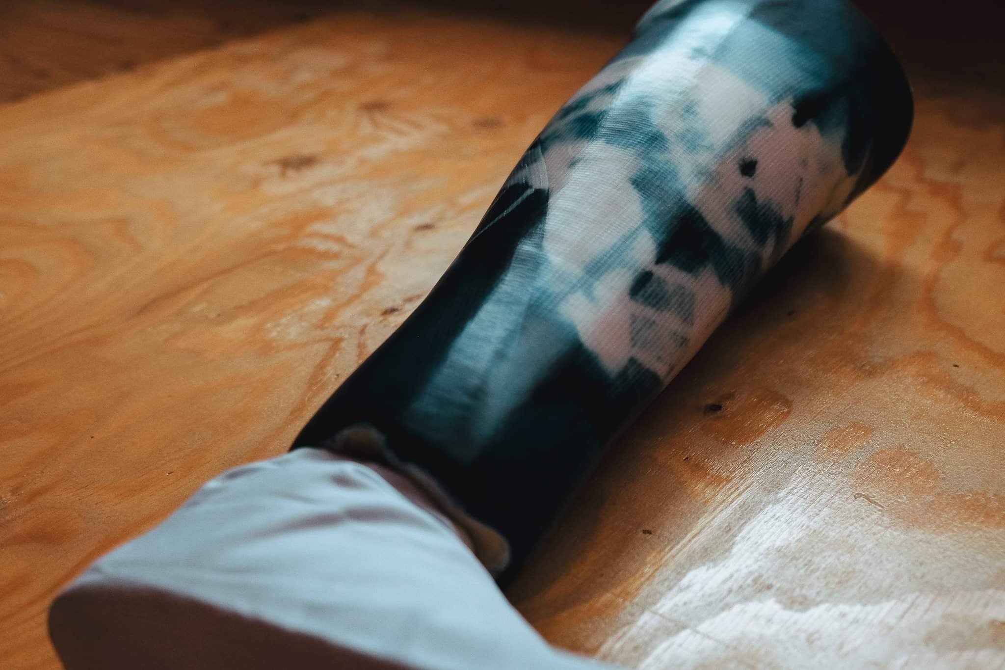藍染の染色過程において、染めた生地を水洗している間に水の中で”輝く藍色”を表現出来ないかと考え、義足の製造過程の中で掛け合わせる事でその色を実現し製作した藍色の義足です。