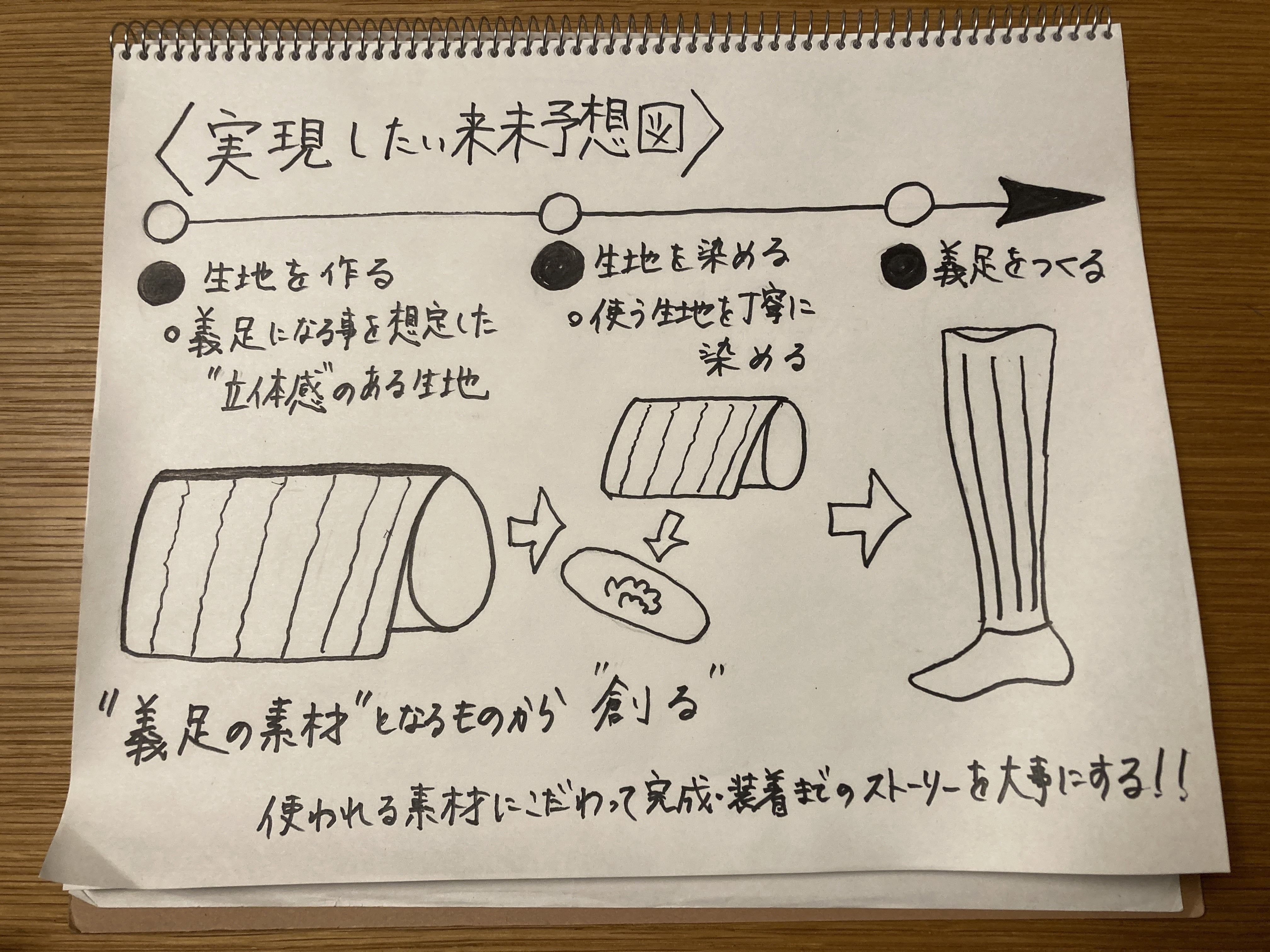 現在、義足に使用される生地は、他のモノづくりで使用される生地の中から強度や見栄えを考慮し選択しています。しかし、義足そのものの立体的な形や身体に合わせた曲線などを考え、義足の向きが変わる事で色の見え方が変わるような義足専用のオリジナル生地が、出来るのではないかと考えています。