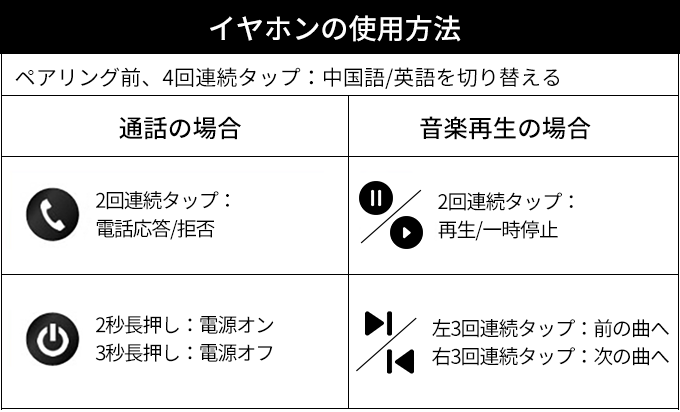 イヤホンにタッチセンサーが装備されており、通話の応答と拒否、音楽の再生などに使用できます。また、左右のイヤホンにはそれぞれ指示ライトが付いており、簡単に区別できます。