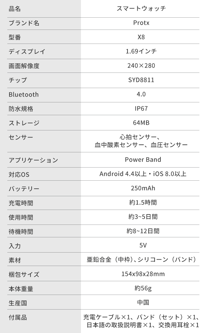 Protx X8は1.69インチのディスプレイを搭載しています。重量はおよそ56g、厚さも12.9mmと軽量なので、スポーツで使用しても腕に過度な負担をかけません。