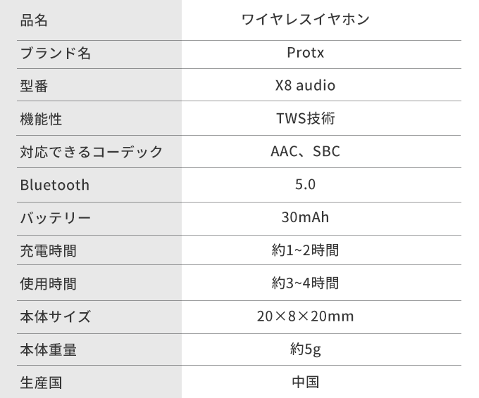 Protx X8は250mAh容量バッテリーを備えています。約1.5時間でフル充電になり、およそ3~5日お使いいただけます。また、フル充電の場合イヤホンを2、3回充電できます。