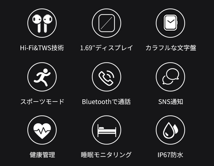 Protx X8は1.69インチの高解像度大画面を搭載。薄型でTWSイヤホンを内蔵し、Bluetoothでの通話や音楽鑑賞も可能。ビジネスやスポーツなどの場面に活躍し、生活をよりスマートにします!