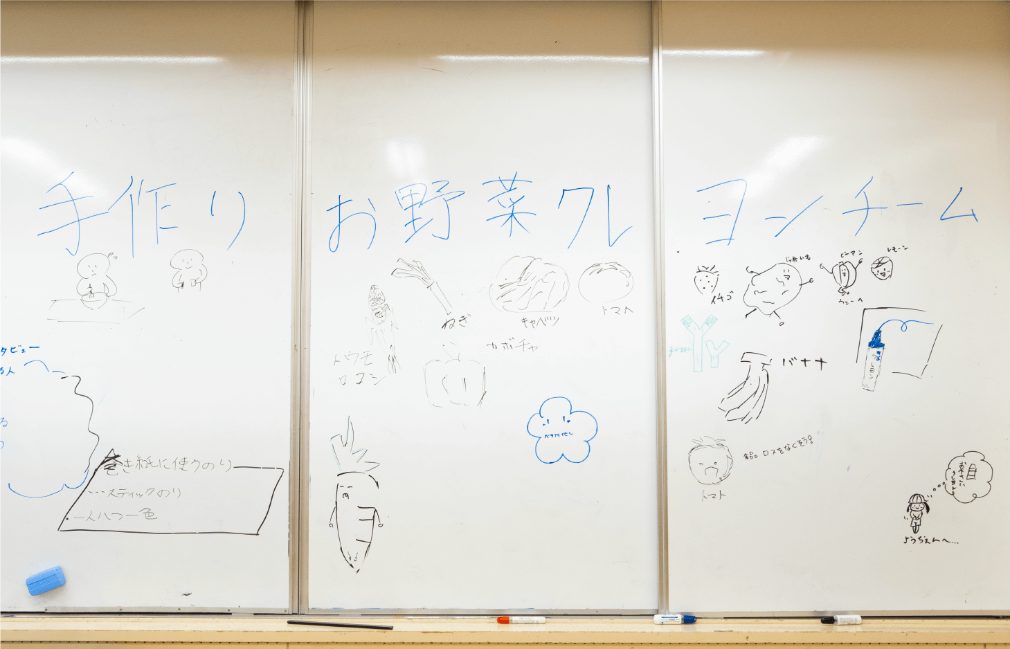しかし、おやさいクレヨン作成の授業に訪問された、オンワード商事株式会社、mizuiro株式会社、富国生命保険相互会社の取り組みや想いを教えてもらい、クレヨン作成だけにこだわるのではではなく、自分たちからフードロスを考える「きっかけを作りたい」という視点を持ち、さらなる目標を目指すようになりました。