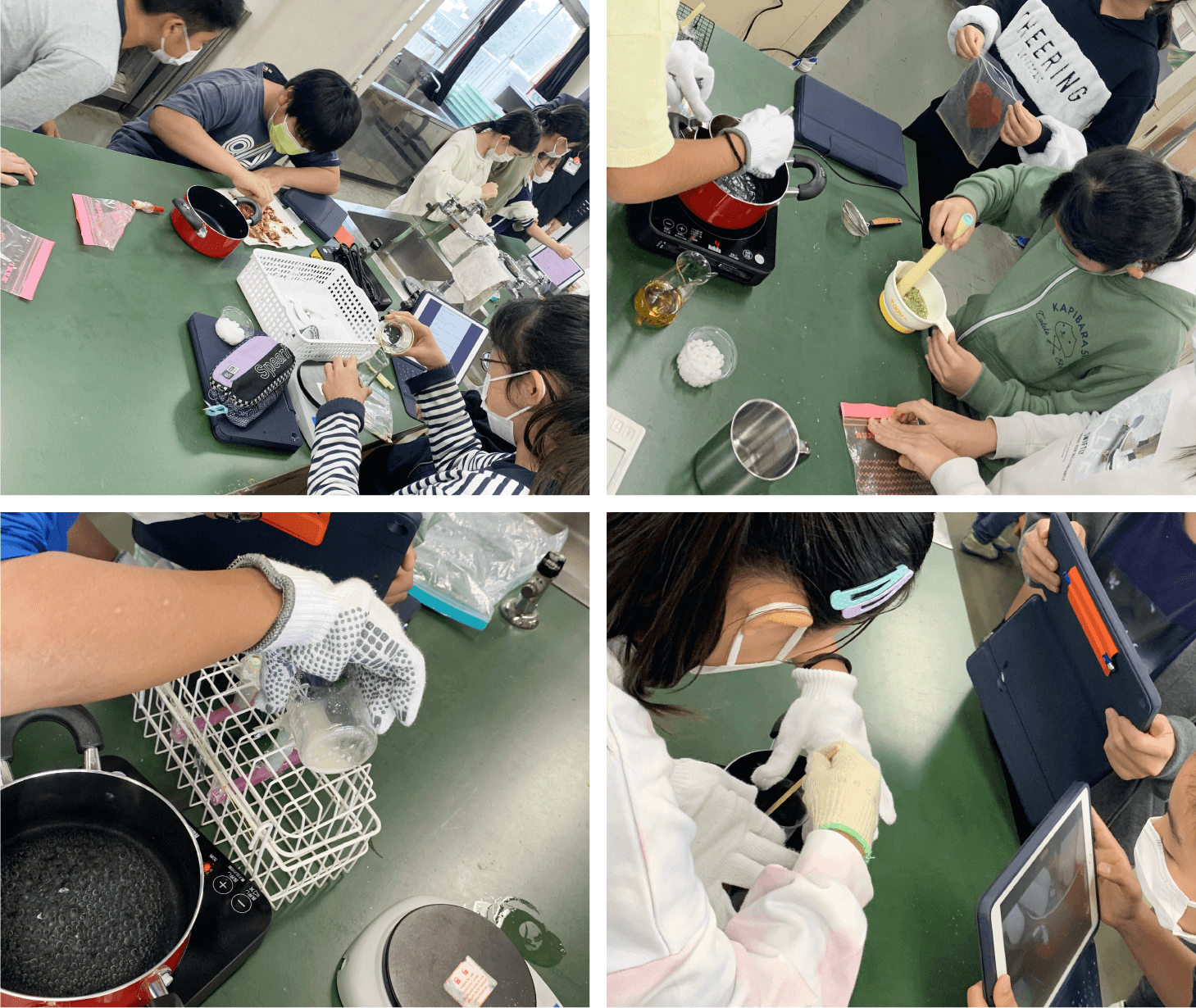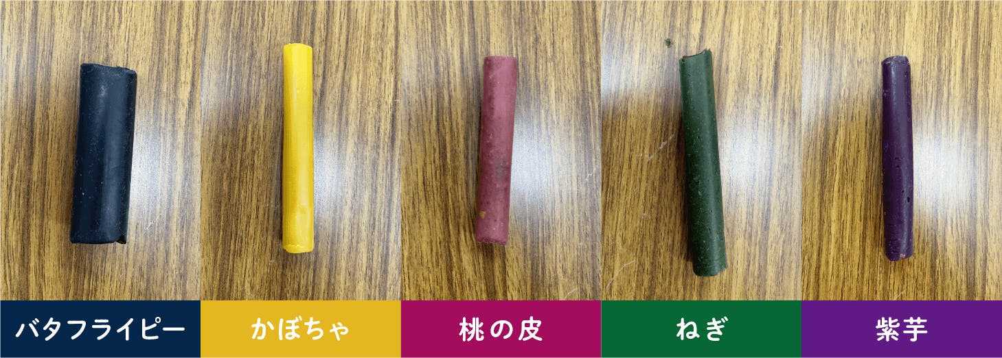 クレヨンを見て、クラスでは自分たちも身近にある野菜の残渣からクレヨンを作ることができないか考えました。
