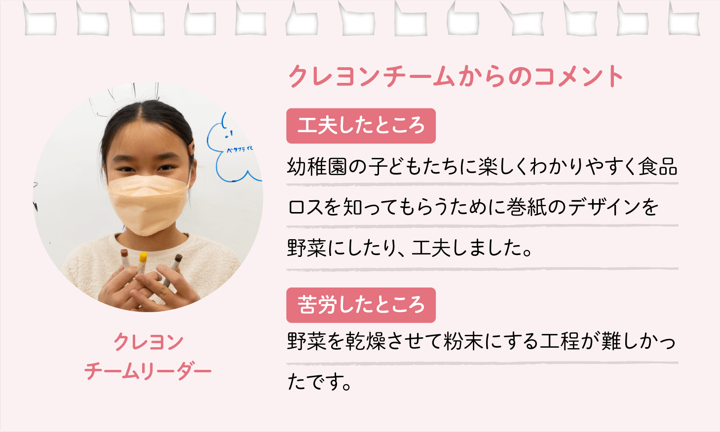 この取り組みで、食べ物の大切さを考えるきっかけになってほしいです。小学校に入学したら、授業でフードロスについて考える取り組みをしてくれたらうれしいです!