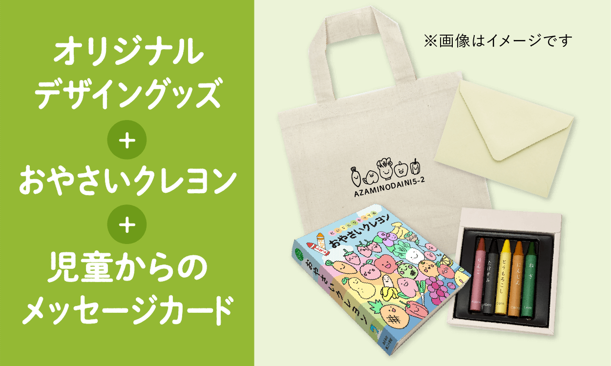 オリジナルクレヨン、オリジナルグッズ、おやさいカルタ、おはなのぬりえと児童たちのお礼のメッセージをセットでお届け。