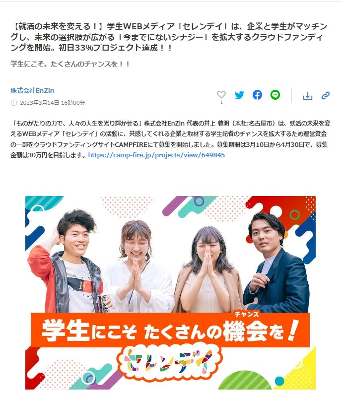 本日、クラウドファンディングについてのプレスリリースをPRタイムスにて公開しました!