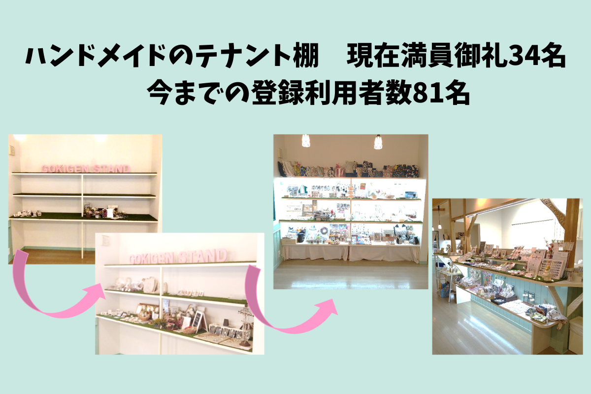 ごきげんスタンドでは、「A4サイズ1枚ほどのスペースだけど、自分の店と思って欲しい‼」という思いから、仕組は同じですが「テナント棚」と呼んでいます。