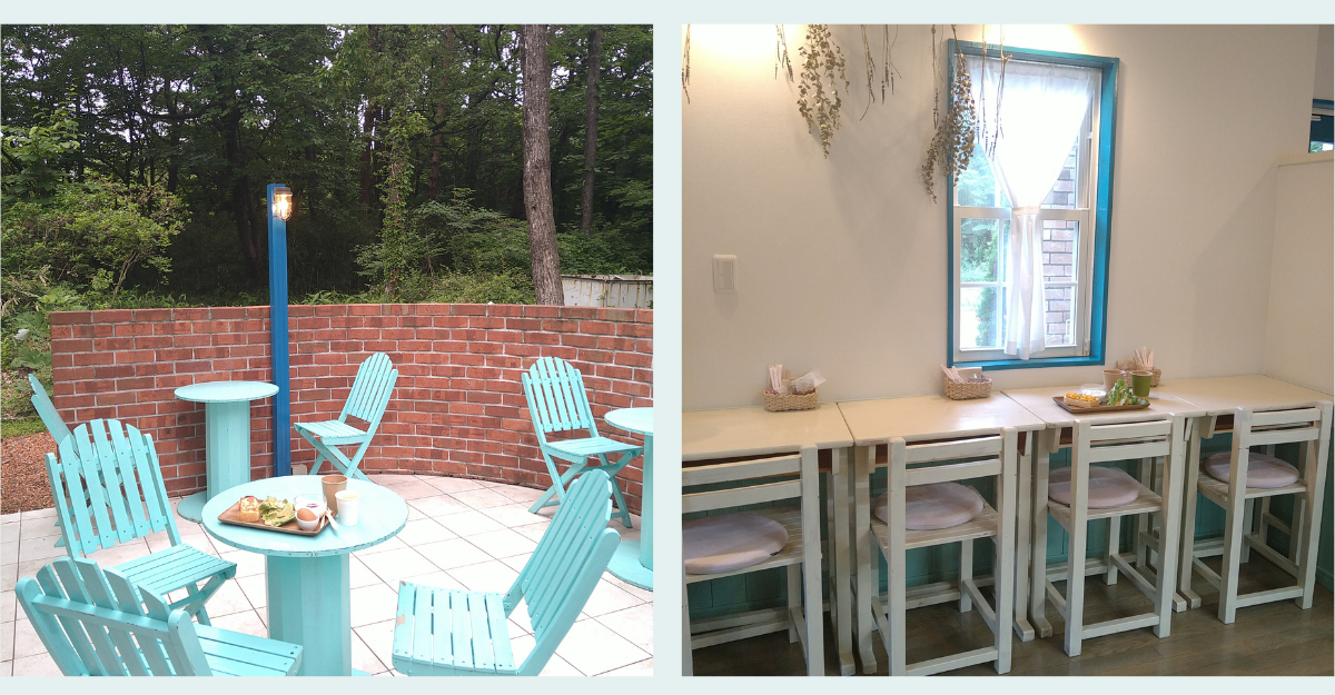 おしゃべりに花が咲き、リクエストからカフェスペースも増設しました。那須塩原の日常から離れた森林が広がる空間で、ほっと一息ついていただけます。