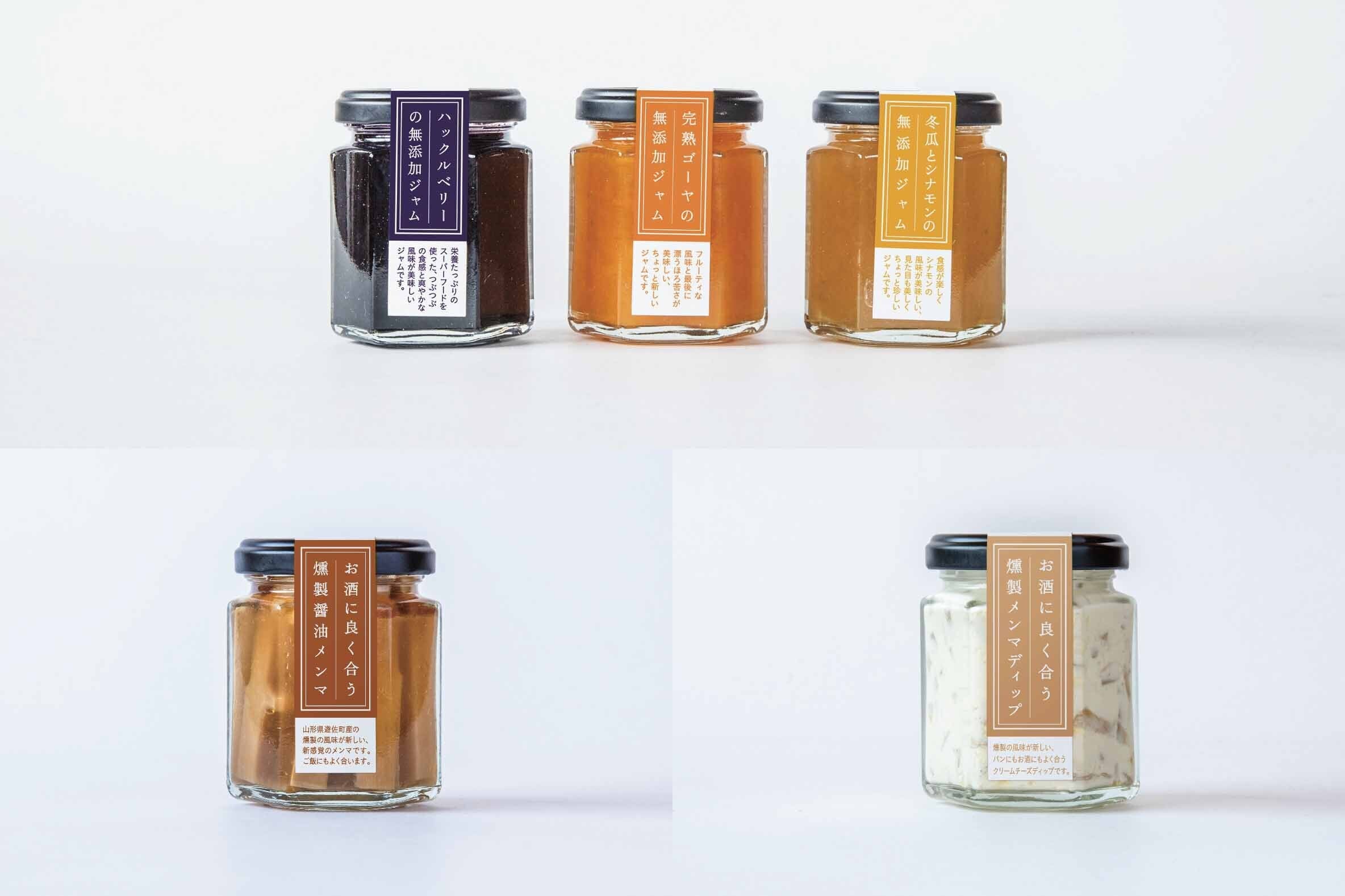 まえむき。で製造しているメンマ2種とジャム3種の詰め合わせです。