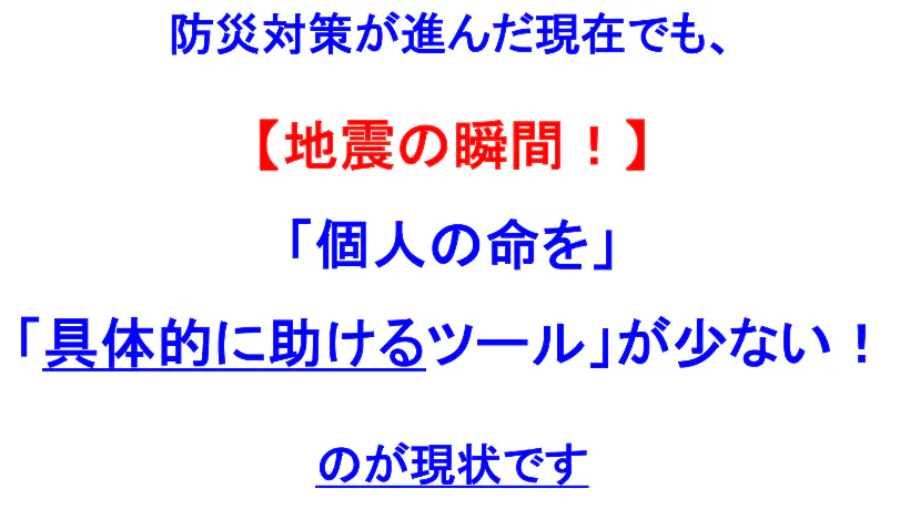 近年、全国各地で多発する地震。 私どもに何ができるのか、私どもにしかできないことは何かと、日々模索しています。 防災には課題が多く、自分の命や大切な人の命を守るには、いつ地震が起こっても、命が助かる仕組みが身の回りに当たり前のように在る社会にする必要があると思っています。