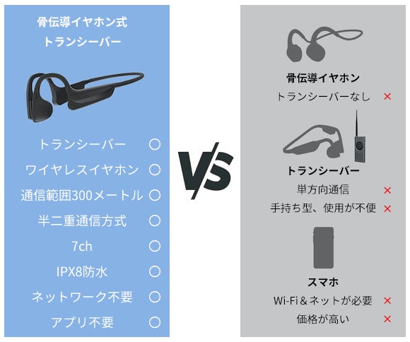 一般的なトランシーバーには手持ち型またはイヤホン型があります。ですが、これらのトランシーバーは使用環境により、通信内容を確認できなかったり、片方の耳を遮蔽され、周囲の音が聞こえないなどのデメリットがあります。