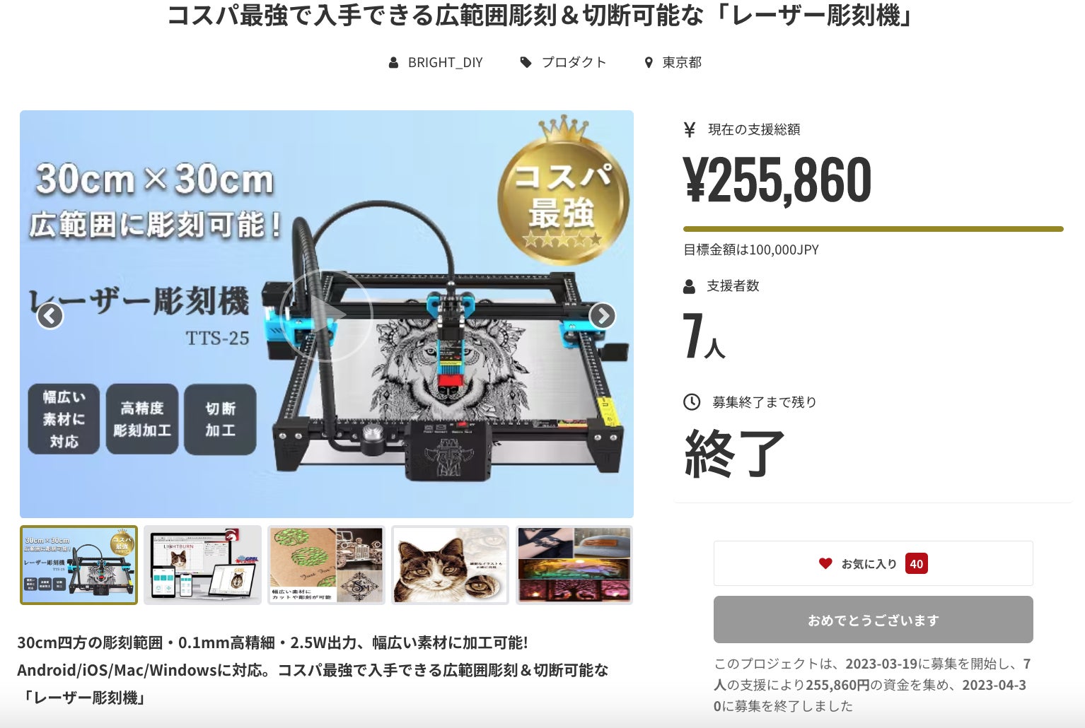皆様にご満足いただけるリターンをお届けできるよう、全力で取り組んで参りますので引き続き、「コスパ最強で入手できる広範囲彫刻&切断可能な「レーザー彫刻機」」をよろしくお願い致します。