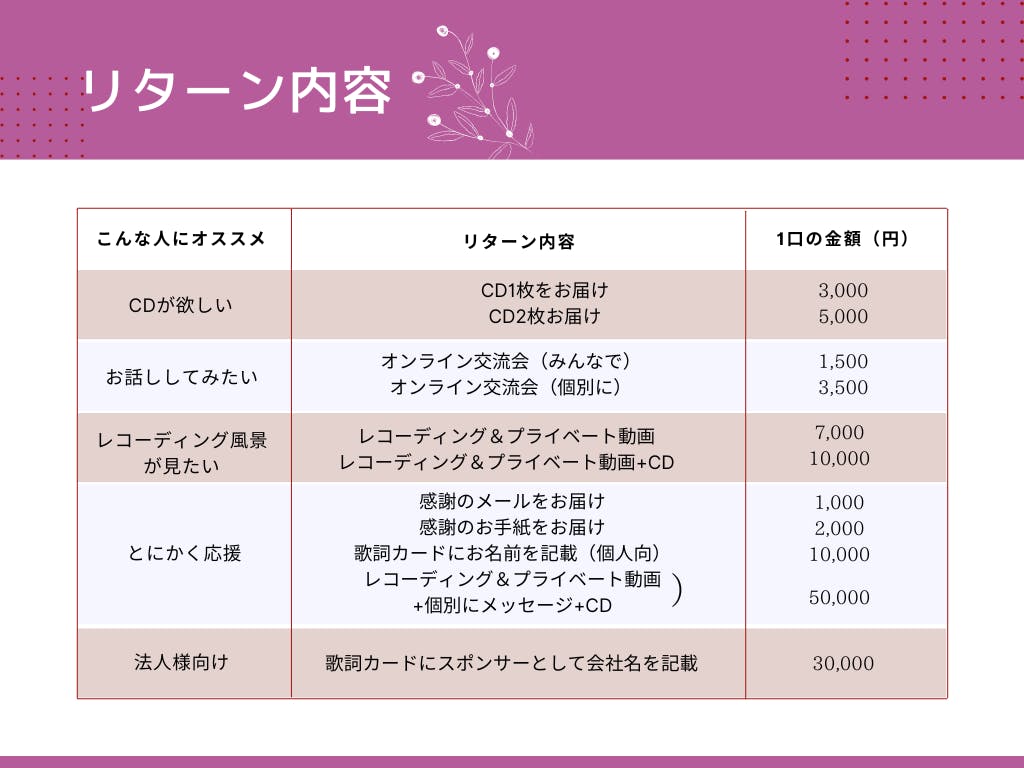 2023/07/04 19:34こんにちは♪お元気ですか?アルバムリリースまであと3日となりました。本当にあっという間でした。ここで資金の使い道をお伝えしておきます。・レコーディングスタジオ代・MIX代等 数万円(Goodman Recordingさんが良心価格にしてくださいましたので非公開とさせていただきます)・編曲料 247,826・撮影料 25,000・デザイン料 0(デザイナーのyukikoさんと、Michaelさんが担当してくださいました。私のパソコンではPhotoshopが重すぎて動かず…本当に感謝しています)・CDプレス料金(200枚) 121,500・リターン関連諸費用 14,065(クッション封筒2,780+クリックポスト185円×61人)・CAMPFIRE手数料 約50,000計458,391+α でした。内356,500円 はクラウドファンディングでご支援していただいた資金を使わせていただきました。本当にありがとうございます!発売後はたくさん聴いていただけるように頑張っていきます^^最近、インスタライブからYouTubeライブに移行し、毎日ライブ配信しております。21時からです♪歌ったりやイベントのことなどを話したりする30分です。気軽に遊びに来てみてくださいね。▶まいこのねいろちなみにアーカイブも残しております。ではまた! もっと見る