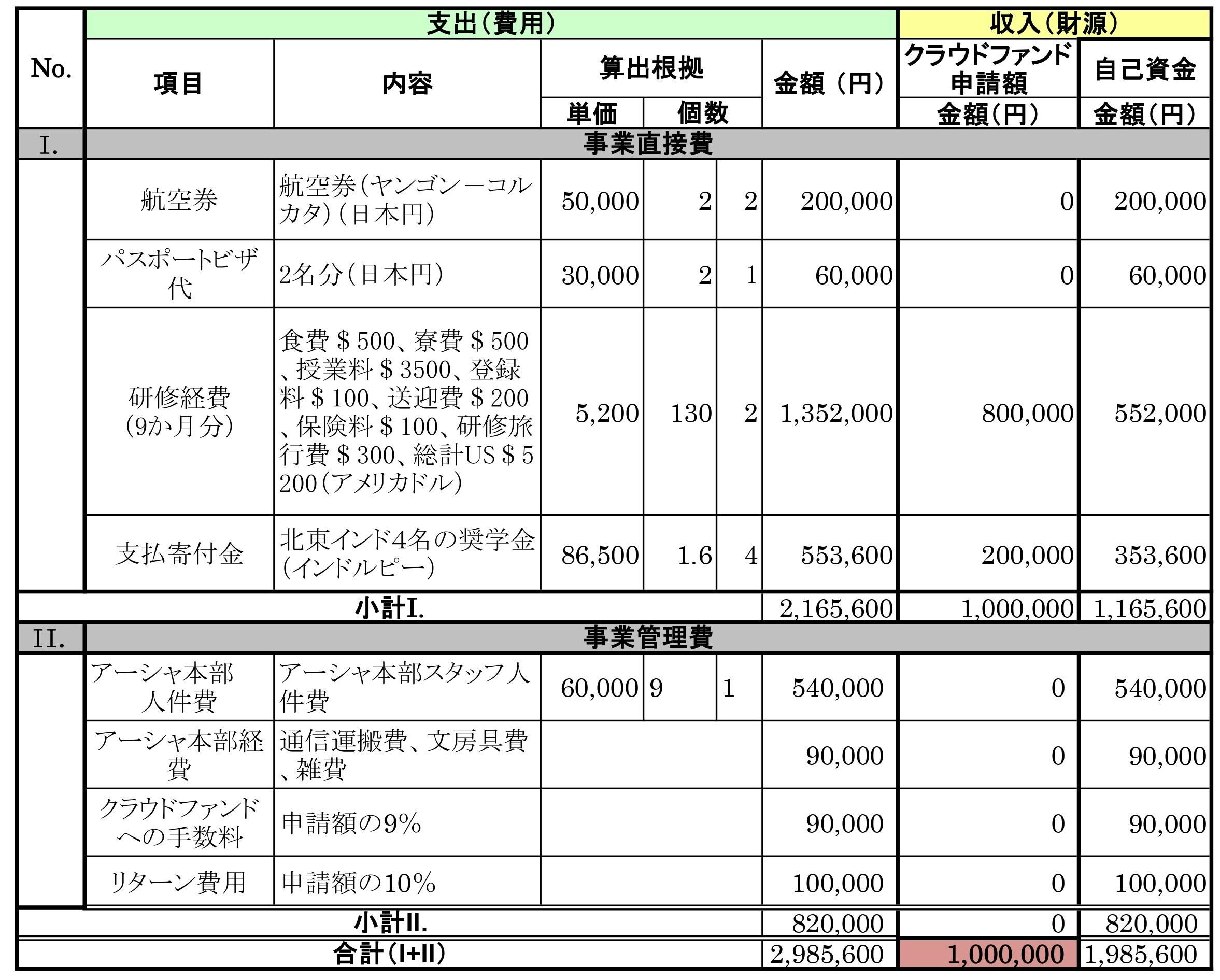 『持続可能な農業・農村開発コース』運営のため(ミャンマー人研修生2名と北東インド研修生4名)の費用は以下のようになります。2023年2月の時点で、既にミャンマーからは2名の研修生のコース参加が見込まれています。彼らの航空券やビザ手配のための経費、アーシャ本部の人件費経費、今回のクラウドファンディング手数料やリターン費用などを含めて2,985,600円の資金が必要になります。このうち1,985,600円を自己資金で賄い、残りの1,000,000円をこのクラウドファンディングによって皆様からの支援金で調達していきます。