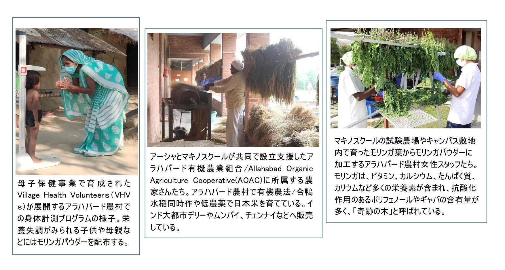 アーシャ=アジアの農民と歩む会支援の下、マキノスクールが実施してきた事業には、農村リーダーの養成、有機農業の推進、農産品加工・開発事業、有機農産物や同加工品販売のための農業組合(アラハバード有機農業組合/AOAC)設立、手工芸品製作等による農村女性収益向上事業のための農村女性縫製団体(AVS)設立、低層カースト出身のこどもたちと社会的地位の低い女性たちのための農村教育、農村栄養改善事業や母子保健事業などが含まれます。