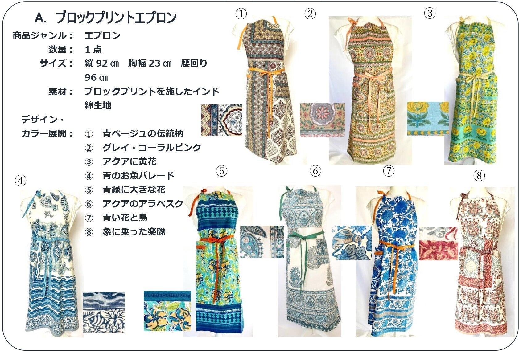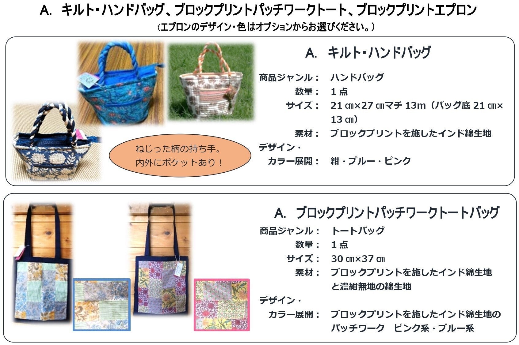 ③農村女性縫製団体(AVS)商品3点/キルト・ハンドバッグ、ブロックプリントパッチワークトート、ブロックプリントエプロン(以下参照)
