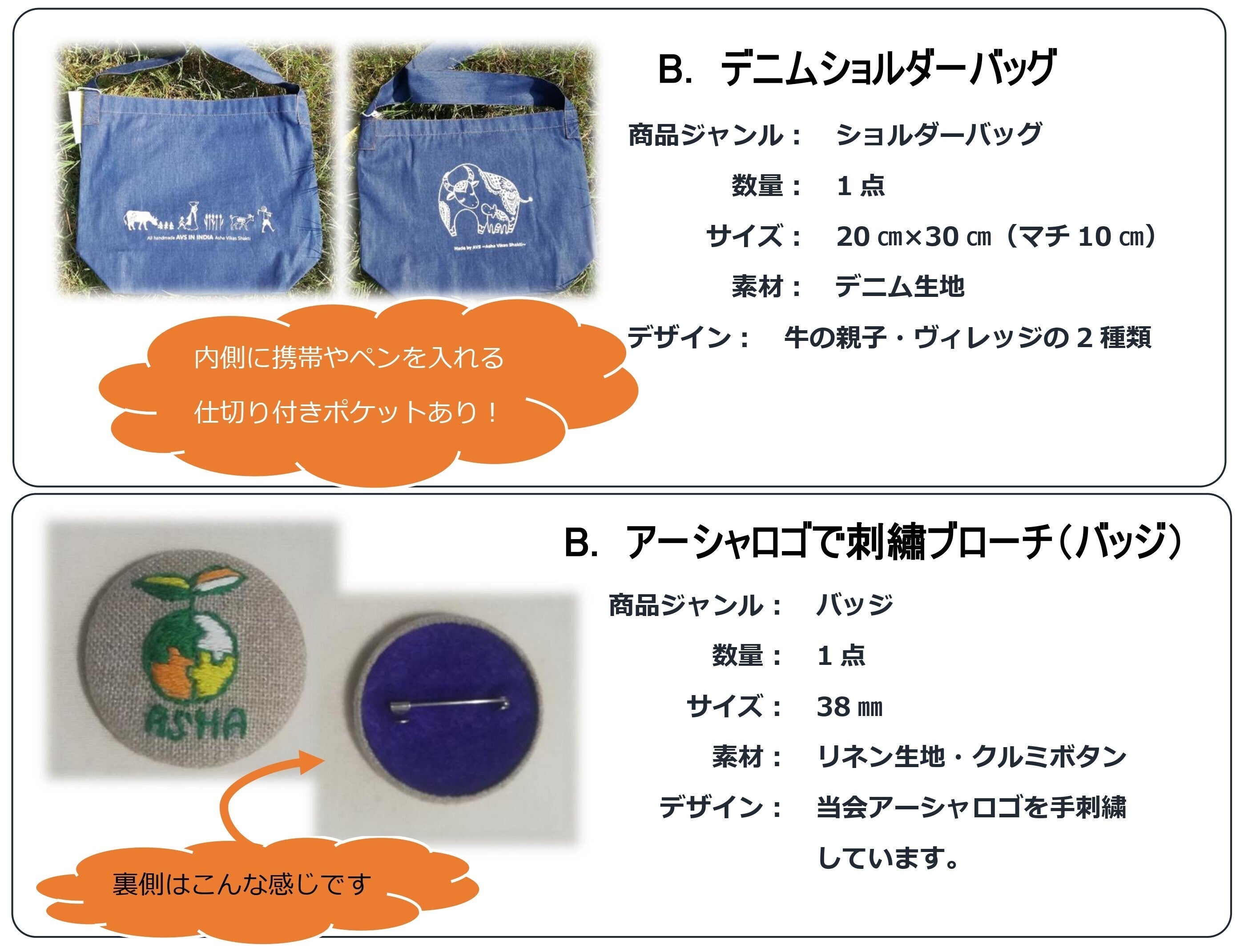 ③農村女性縫製団体(AVS)商品4点/コインケース、キルトペンケース、デニムショルダーバッグ、アーシャロゴで刺繡ブローチ(バッジ)(以下参照)