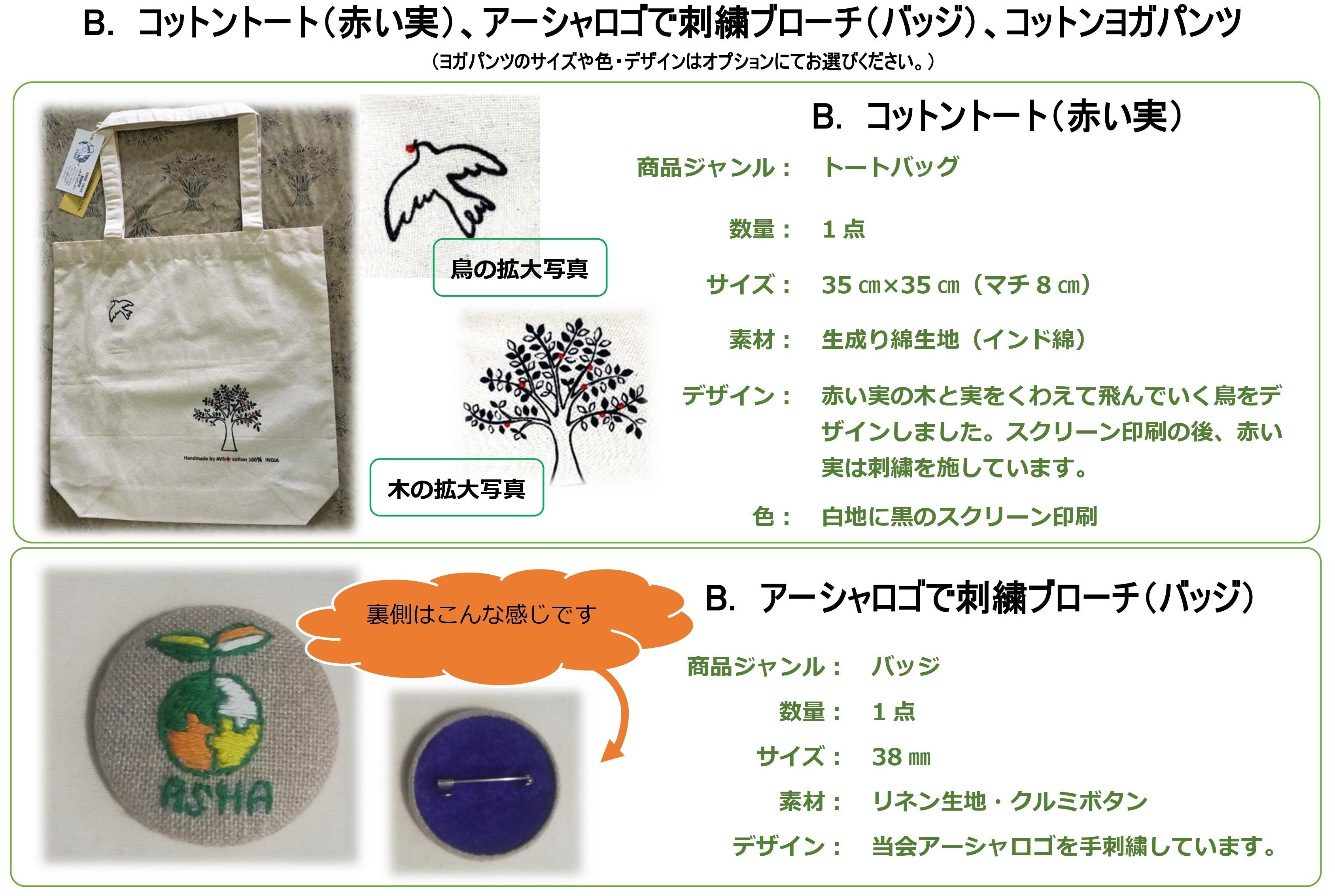 ③農村女性縫製団体(AVS)商品3点/コットントート(赤い実)、アーシャロゴで刺繡ブローチ(バッジ)、コットンヨガパンツ(以下参照)