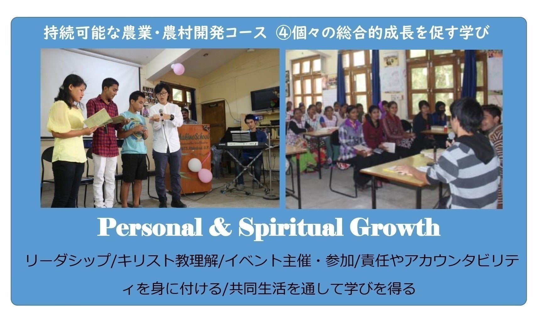 『持続可能な農業・農村開発コース』を実施するマキノスクールは、献身的な農村リーダーや技術者の存在は、自立・持続可能な発展を促進するために不可避であると信じています。したがって、農村リーダーのみならず、農村に生きる人材のそれぞれに合った技術の指導に焦点を置いています。