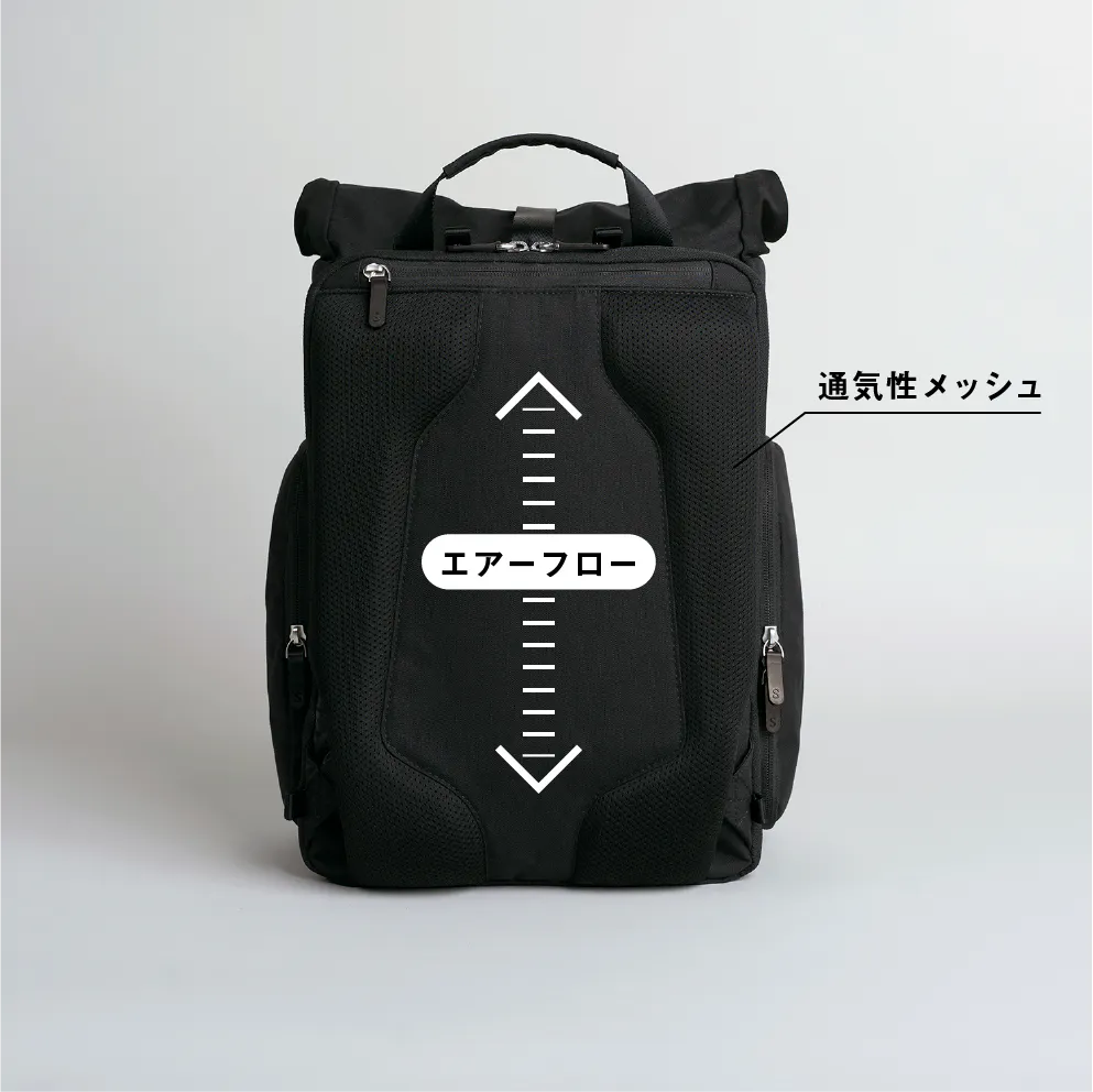 背中と触れるバッグ背面部分は、通気性のよいメッシュ素材とエアフロー(空気の通り道)を取り入れ、暑い夏でも快適に保たれるように設計しました。