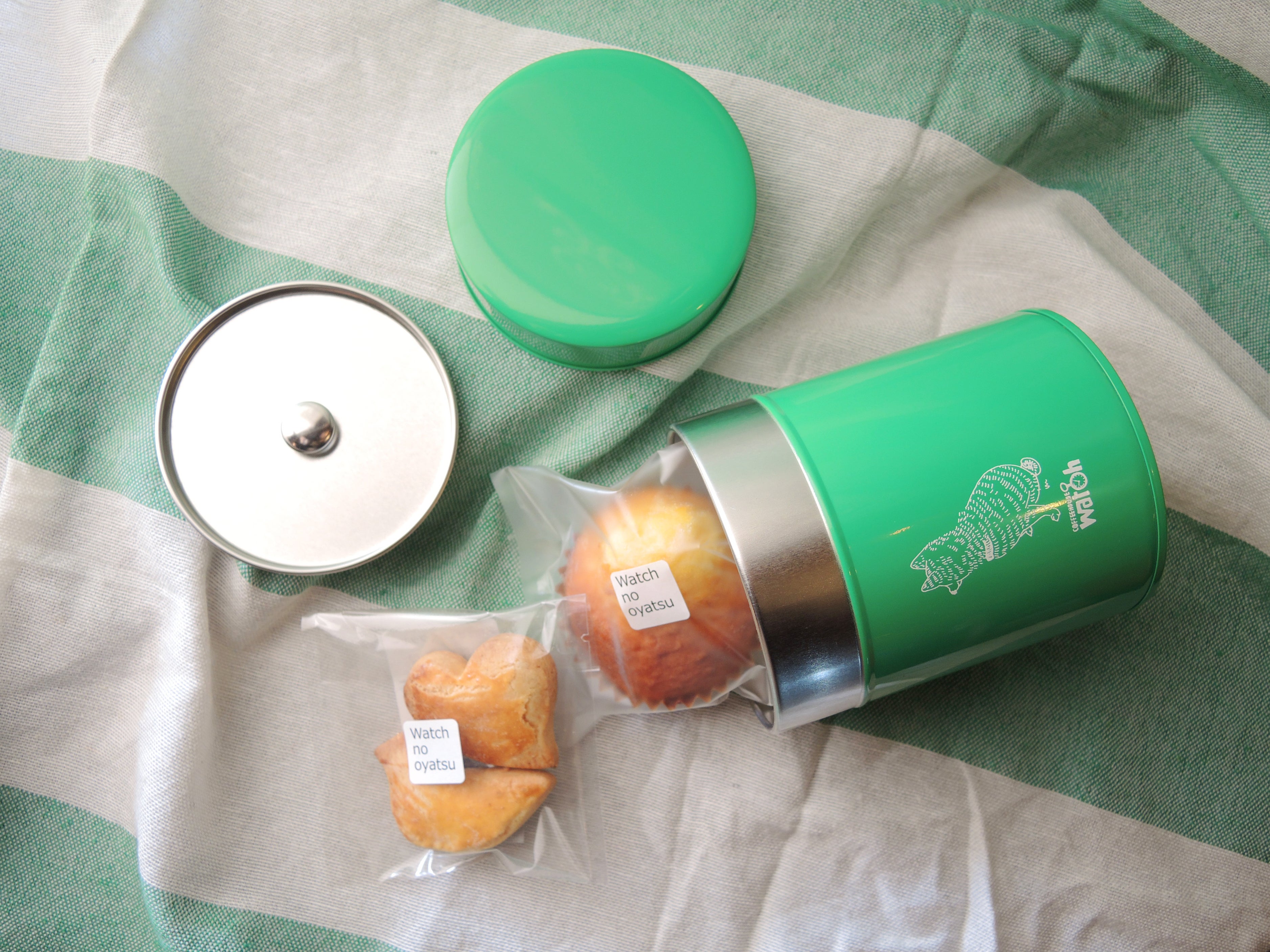 ・オリジナルキャニスターとウオッチのお菓子(緑のチロ缶)