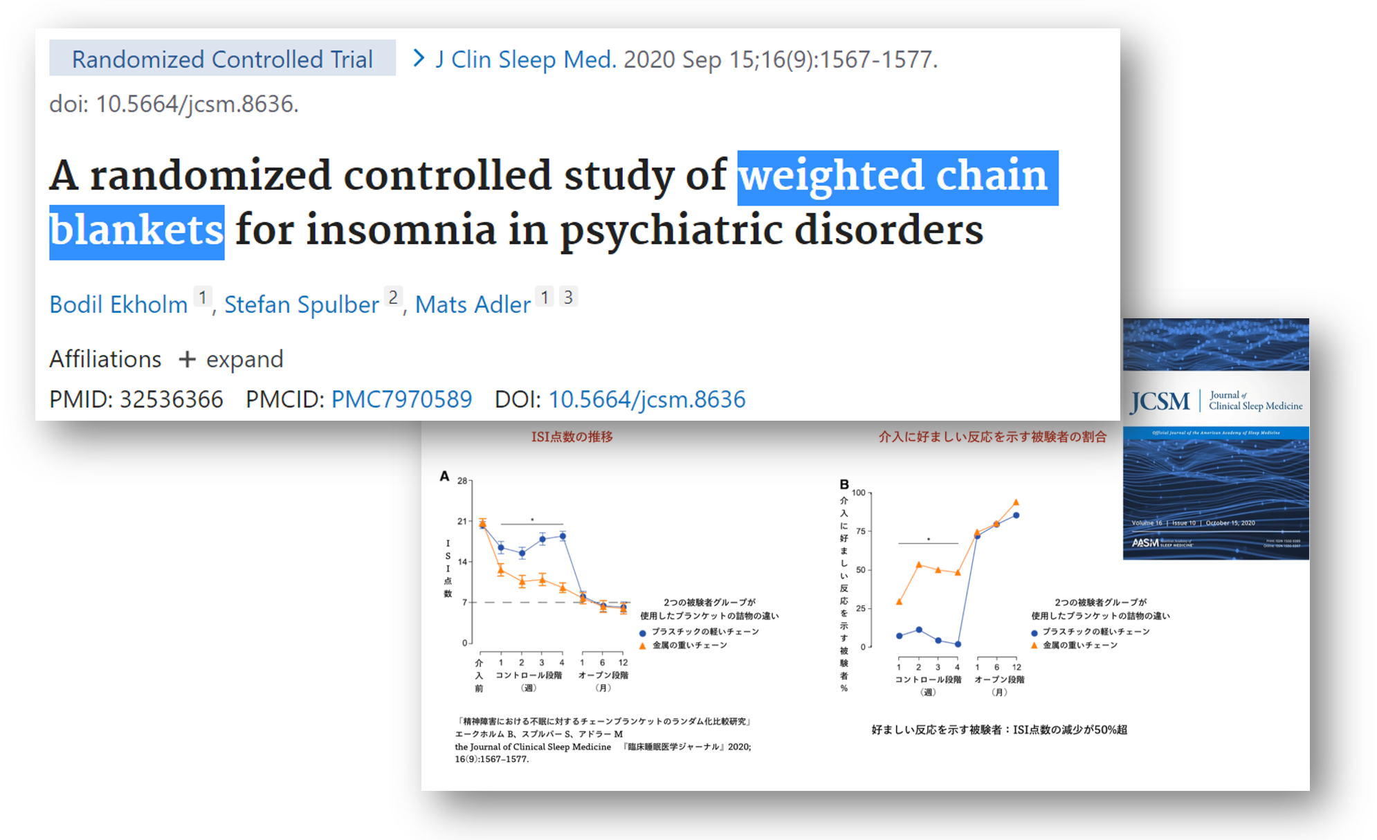2020年9月、有名なカロリンスカ研究所のボディル・エクホルム博士達の3名が加重ブランケット効果に対する臨床試験論文をJCSMで発表しました。睡眠障害のある成人を対象にブランケット2種の比較実験を行った結果、著しい効果の違いが現れています。一般的なブランケットより、加重ブランケットを使用した方が深い睡眠と睡眠状態の時間が増え、浅い眠りと眠りに付けない状態の時間が減少しているのです。