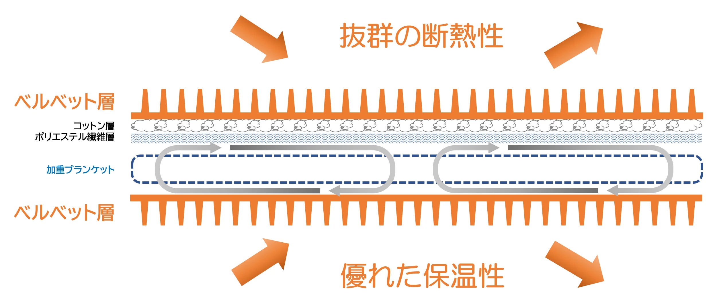 5種の素材を用いて、特殊な7層構造で通気性に優れたブランケットが実現します。