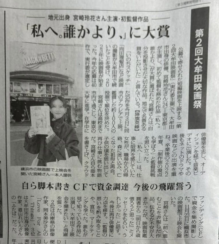 2024/11/27 12:01先日、横浜 シネマ・ジャック&ベティにて上映会を開催いたしました。ご来場いただいた皆様、お忙しい中誠にありがとうございました。沢山の方にご鑑賞いただけたことで、本作『 私へ。誰かより、 』は意味のある作品だと再認識いたしました。今後も、上映会など皆様にお届けできるよう精進いたします。ーーーーーーー大牟田映画祭 大賞受賞を受け、毎日新聞社 様に取材をしていただき、11.26(火)筑後版・佐賀版の朝刊にて掲載されました!!こうして本作が完成し、大賞受賞という名誉ある賞をいただけたのは皆様の温かな応援があってこそだと思います。改めて、感謝申し上げます。引き続き、応援のほどよろしくお願いいたします!! もっと見る【祝】大牟田映画祭 "大賞" 受賞しました!!