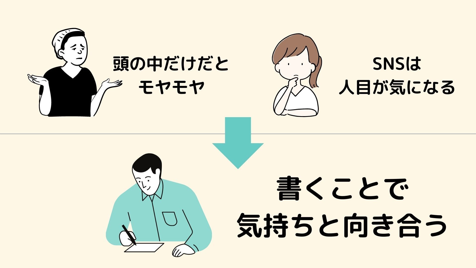 SNSを使って気持ちをつぶやくこともできますが、誰かの目に留まることを意識して自分のありのままの気持ちを表現できない時もあります。「誰にも見せないけど書き出して言葉にできる」という環境があることで、自分のありのままの気持ちにじっくりと向き合うことができます。